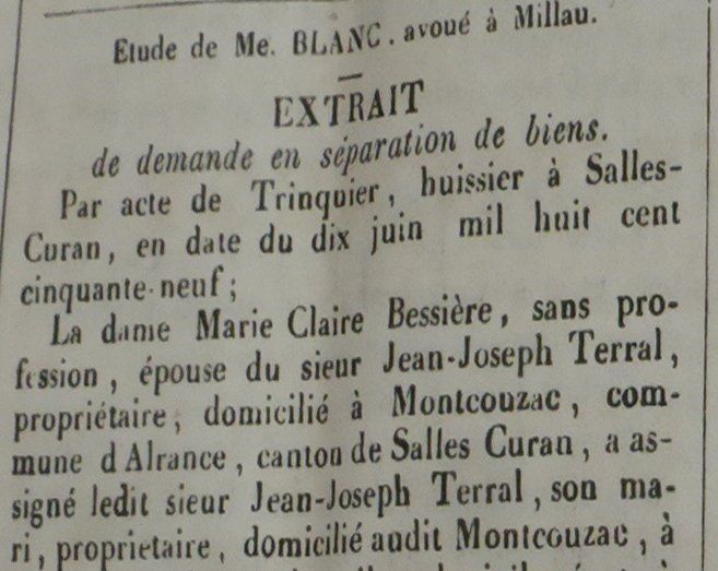 4 jours plus tard, Marie Claire Terral va au tribunal, elle expose son cas et demande à protéger sa dot en faisant une séparation de biens avec son mari. Cette demande lui est accordée et, par exploit d’huissier du 10 juin, son mari est averti de sa démarche. Il faut attendre le 12 aout 1859 pour que le jugement de séparation soit prononcé. La lecture de celui-ci est faite 10 jours plus tard au tribunal de commerce.