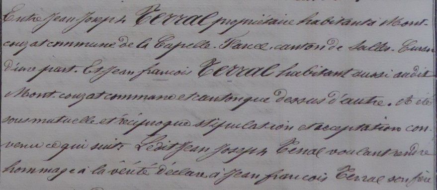 Côté ventes, l’une concerne du terrain vendu à un prêtre, la deuxième un terrain vendu sous seing privé. La troisième concerne des arrangements entre les deux frères Terral. En effet dans le contrat de mariage, et pour éviter le partage, Jean Joseph devait payer à son frère sa part de droits successoraux, ce qui n’a pas été fait. Jean Joseph avait promis à son frère de lui faire construire une maison, ce qui n’a pas été fait. Bref, l’acte formalise les dettes fraternelles.