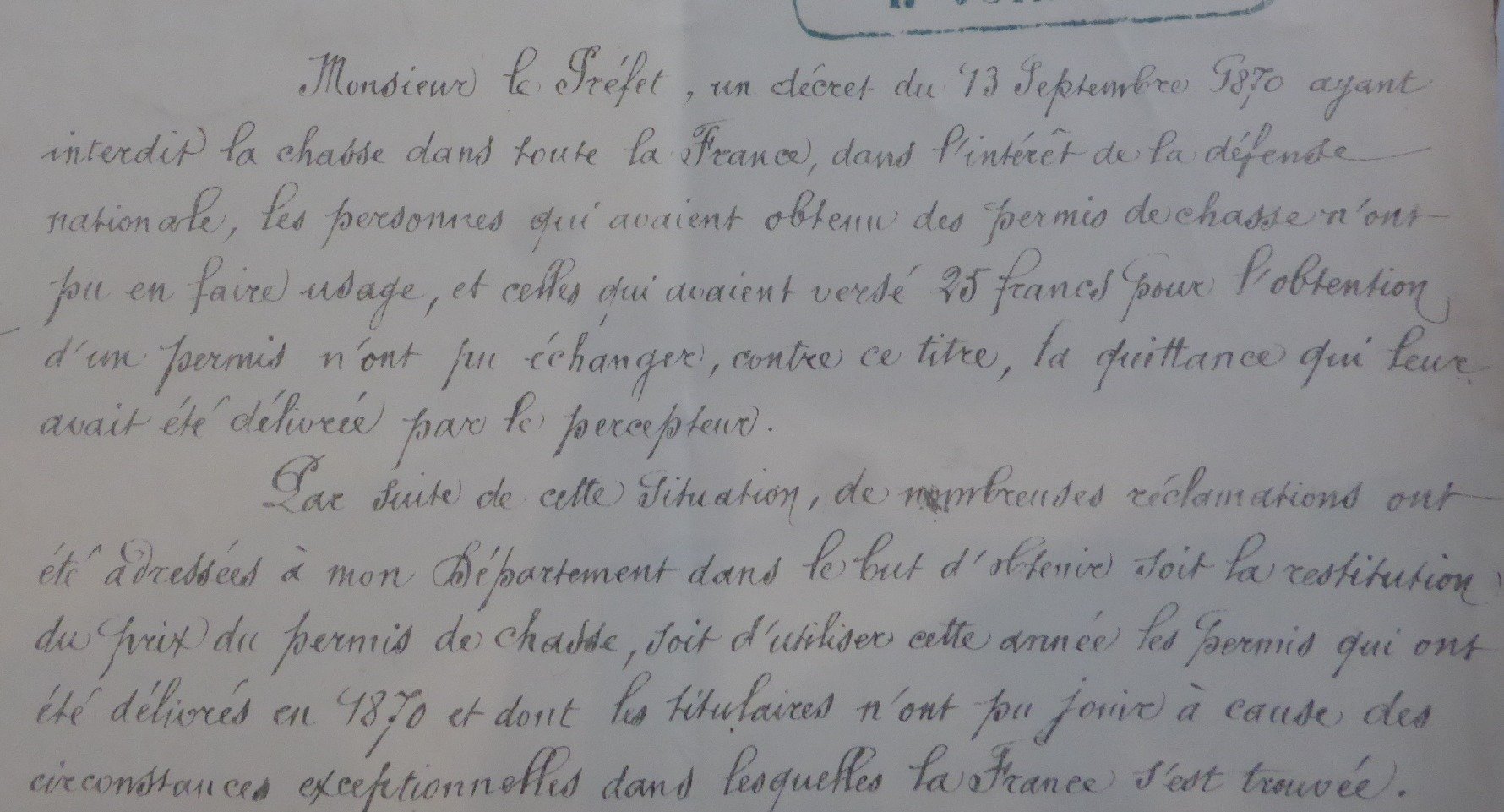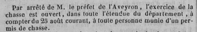 Juillet 1870, la France est en guerre contre la Prusse. Arrive la période d’ouverture de la chasse. Un décret national parait le 13 septembre pour interdire la chasse dans toute la France dans l’intérêt de la défense nationale . L’arrêté du préfet de l’Aveyron interdit la chasse dans le département à compter du jeudi 22 septembre.