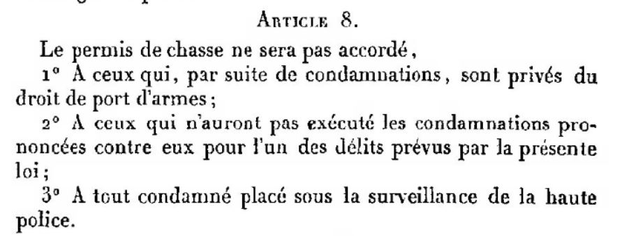 C’est la loi du 3 mai 1844 parue dans le bulletin des lois N°1094 qui va modifier la réglementation de la chasse en France en remplaçant les permis de port d’armes par les permis de chasse. Elle abroge le décret du 4 mai 1812 et la loi du 30 avril 1790.