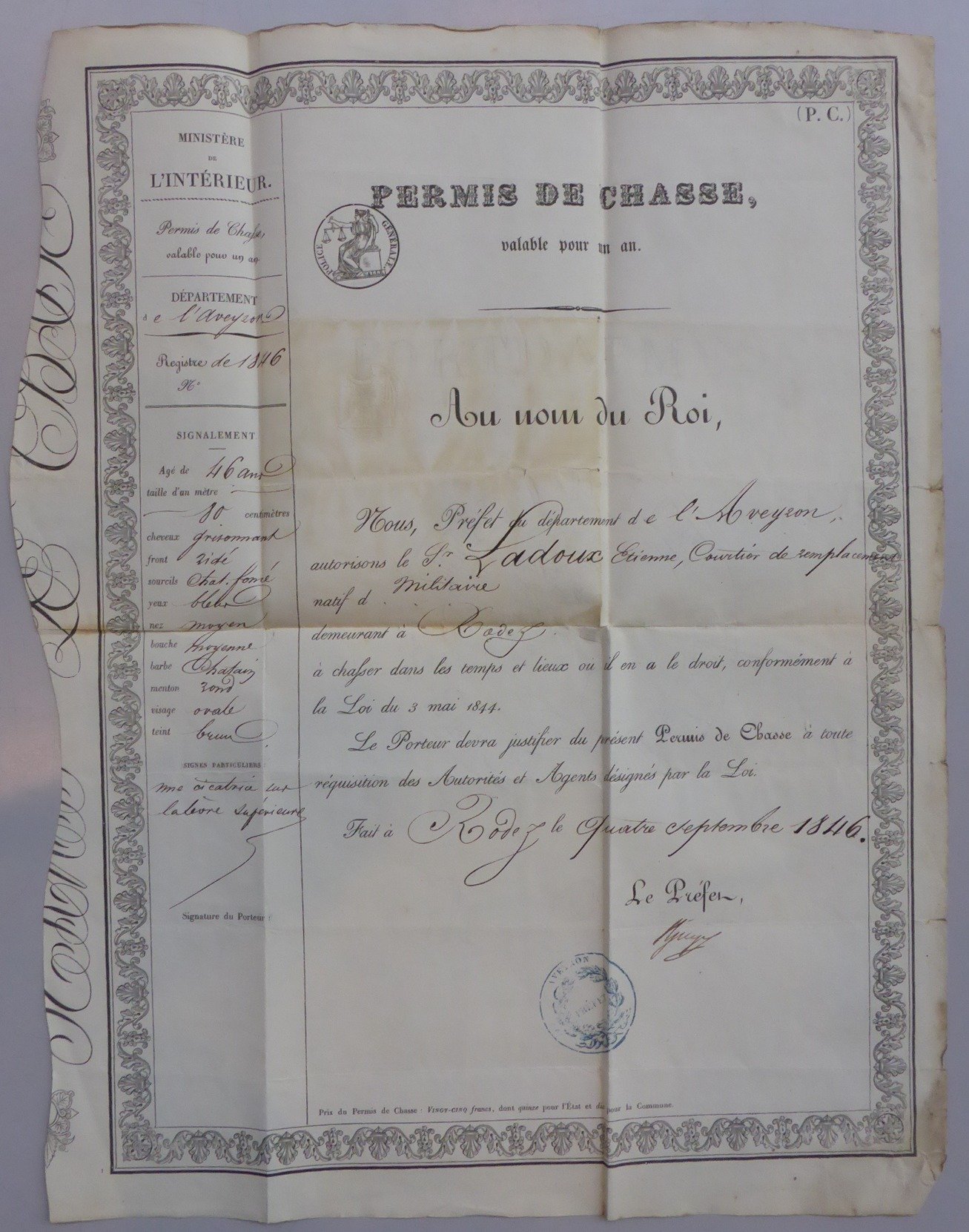 Cette demande est soumise à l’avis du maire, du sous préfet, et du préfet. Quand celle-ci est acceptée et que la quittance est acquittée, le chasseur se voit attribuer un permis au format A4, valable un an, avec son signalement et son lieu de résidence.