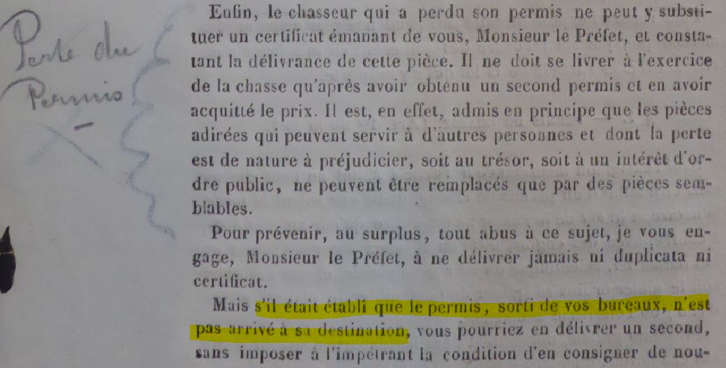 Ayant constaté que certains se permettaient d’ aller chasser dès qu’ils avaient payé la quittance ou après réception de l’avis de réception du permis, les modalités administratives changeront plusieurs fois avec notamment une délégation de signature aux sous préfets en 1860.