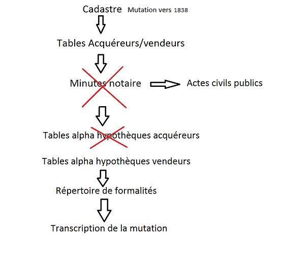 L’autre solution c’est de passer par les hypothèques. Registre indicateur, table alphabétique, répertoire de formalités, registre de transcription des mutations, quatre levées plus tard notre histoire de notaire est oubliée.