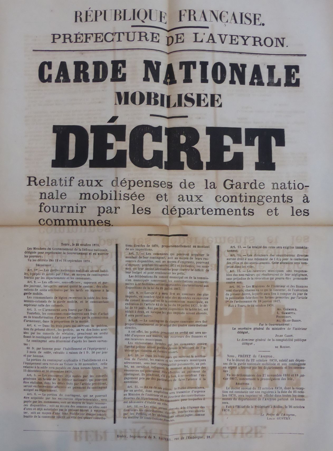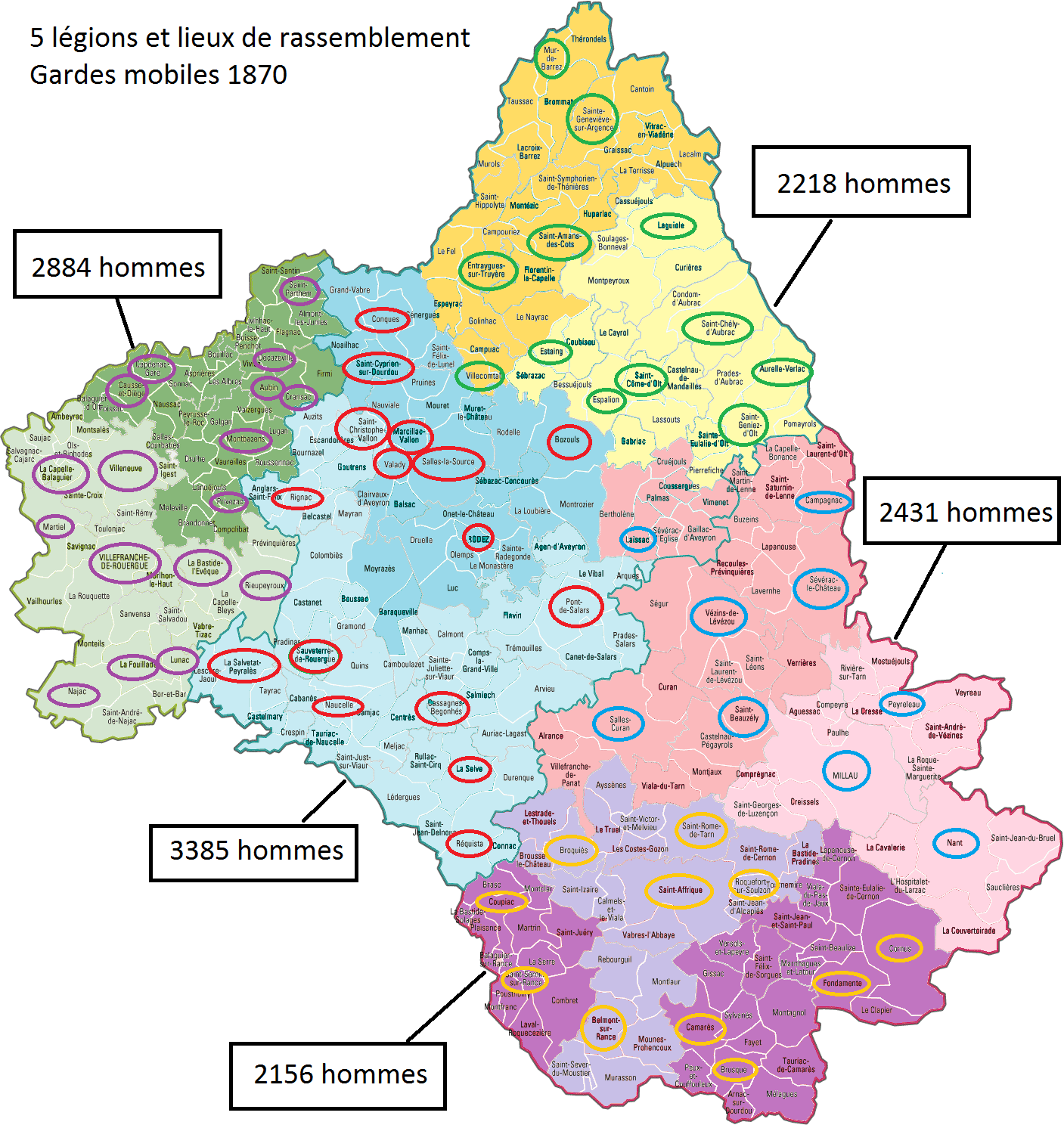 Dans son arrêté du 17 novembre 1870, Louis Oustry, préfet de l’Aveyron, demande la création de 5 légions réparties en 10 bataillons et 73 compagnies.