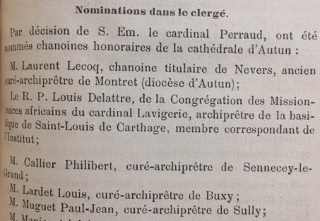 Nommé chanoine honoraire de la cathédrale en 1895, il refusera le titre de chanoine titulaire et théologal du chapitre. En effet, il ne voulait pas quitter Sully pour déménager à Autun comme l’imposait sa nomination.