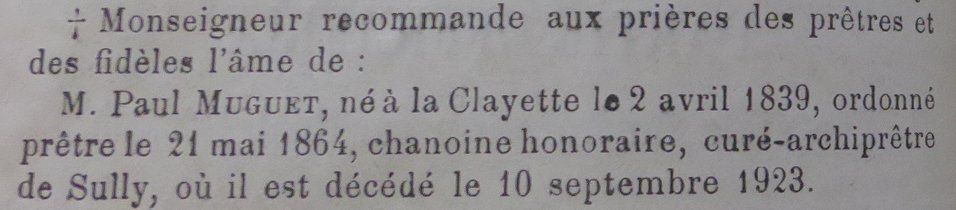 Malgré ses problèmes de surdité, le chanoine Muguet a assuré les cours de catéchisme jusqu’au bout. Ses infirmités l’accablant, il avait demandé l’autorisation de se retirer. Mais c’est bien comme curé de Sully qu’il mourut, fidèle à son poste.