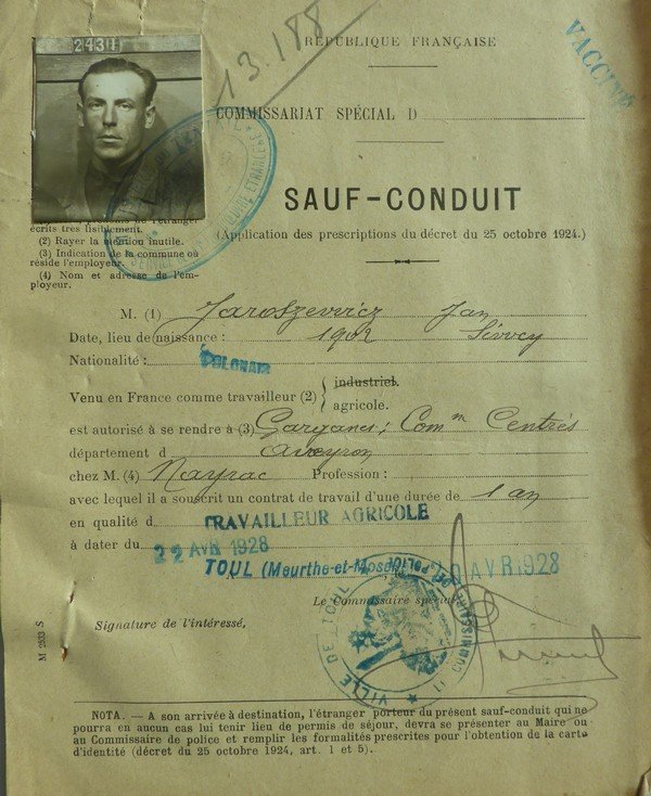 Quand le travailleur étranger arrive en France, il se présente au commissaire de police du poste frontière qui lui établit un sauf conduit. Celui ci lui permet de se rendre dans la commune où l’attend son employeur.