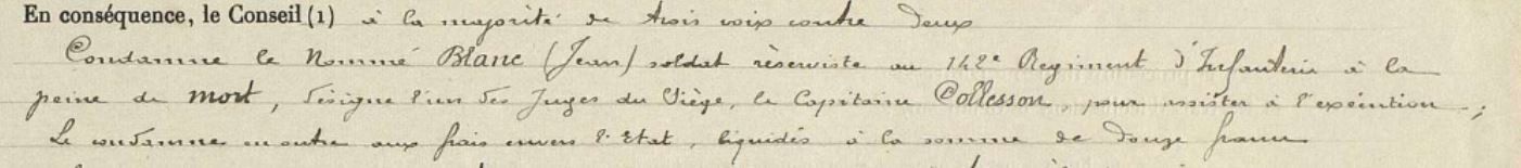 Jean Blanc est amené sur le terrain par un détachement de 50 hommes. Pendant qu’on lui lit son jugement, un soldat lui bande les yeux et le fait mettre à genoux. Le peloton fait feu, un sous officier lui donne le coup de grâce et le médecin constate le décès.