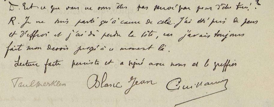Jean Blanc est emmené à la gendarmerie de Toul où il est interrogé et explique avoir déserté. Il a jeté son sac, sa musette, son bidon, ses cartouchières, son fusil et sa baïonnette à 1km de son cantonnement.