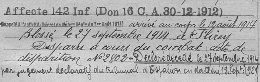 “Ce militaire, blessé au cours du combat n’ayant plus reparu à son unité, est présumé mort. Le manque d’éléments n’avait pas permis d’établir cet acte.”