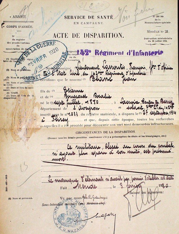 Le 3 février 1920, un acte de disparition est établi pour Jean Blanc. Il indique les circonstances recueillies.