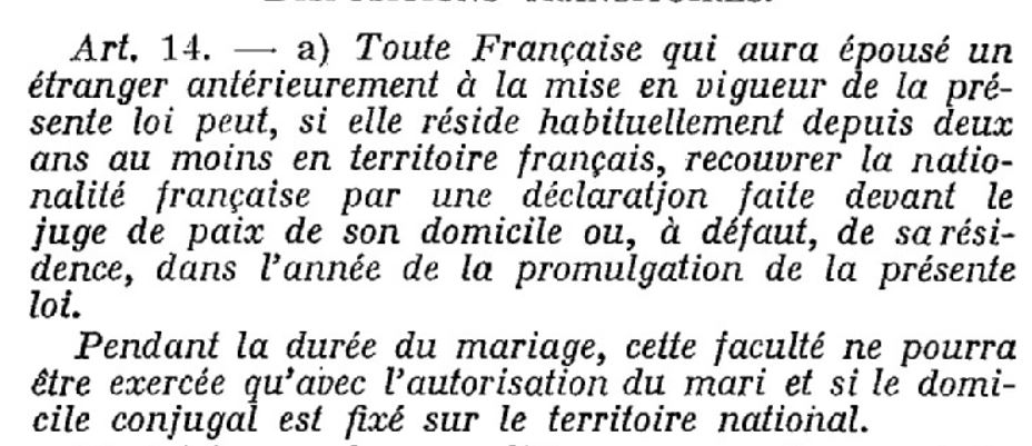 Sa femme peut recouvrer sa nationalité, à condition d’en faire la demande avant le 10 aout 1928 au juge de paix de son canton . Pourquoi cette date? A cause d’une nouvelle loi.