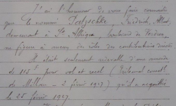 Mais Mr Patszchke n’est pas en règle avec la législation française en vigueur sur le séjour des étrangers . Sa carte d’identité N°1235646 du 5 mars 1927 aurait due être renouvelée au plus tard le 31 mars 1929. Ce qui n’est pas le cas.