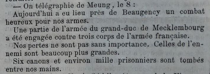 Les combats font rages aux portes de Beaugency en ce début de mois. Orléans semble s’être rendue « à discrétion », Meung est tombée aux mains ennemies.