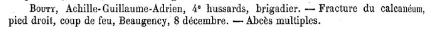 Notre futur docteur a été blessé lors du combat du 8 décembre 1870 . Il a reçu un coup de feu et a une fracture du calcanéum au pied droit et de multiples abcès.