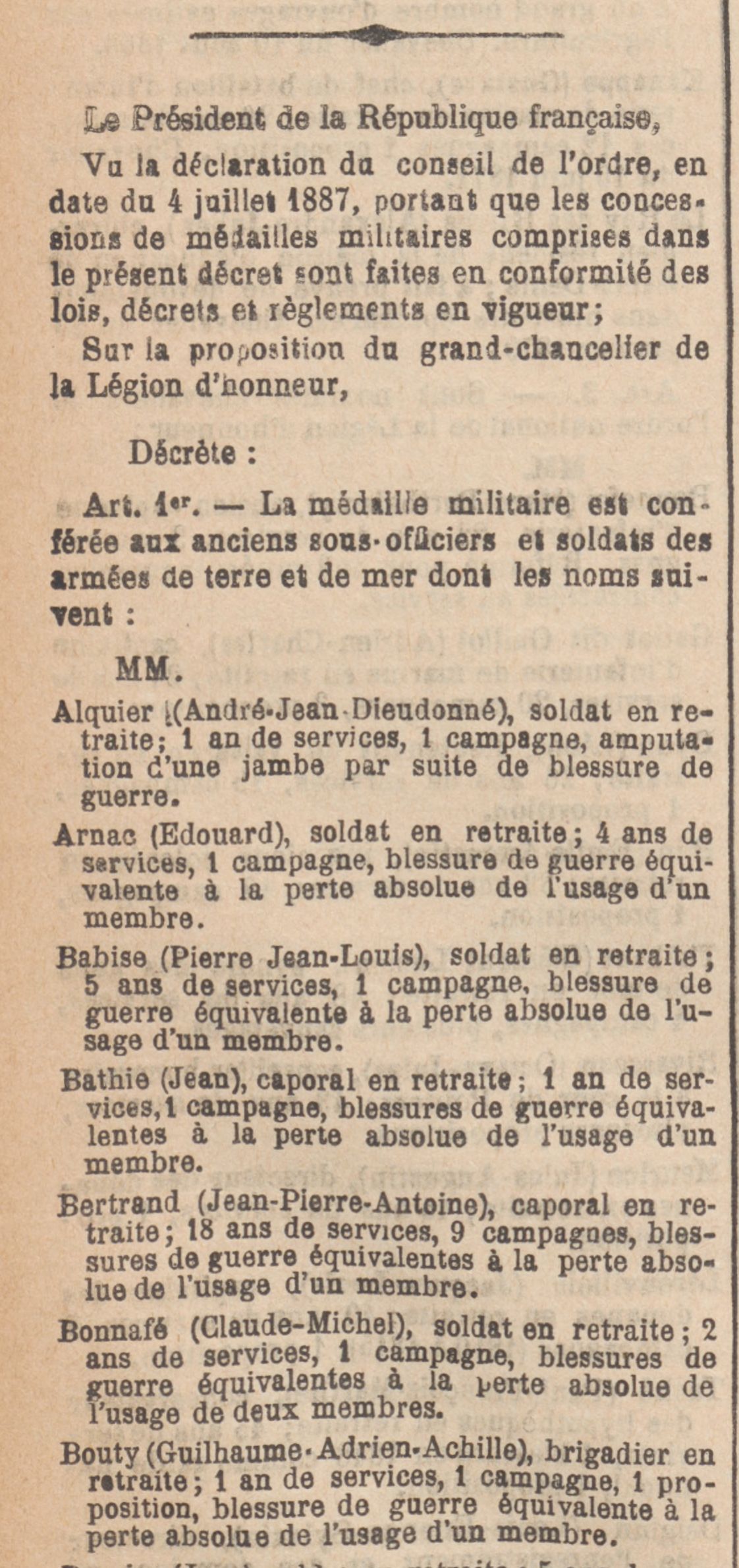 Il reçoit la médaille militaire en juillet 1887 pour « perte absolue de l’usage d’un membre ».