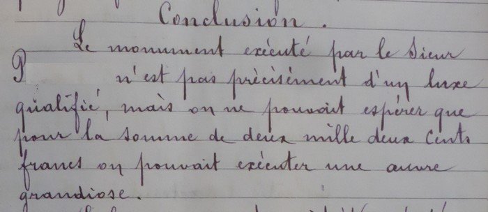 Mme veuve C s’explique. Le premier devis était de 2000 francs pour un monument imitation granit et il a été porté à 2200 francs en accord entre les deux parties….. Mais les travaux n’ont pas été à la hauteur … ou plutôt à la longueur ! Les deux côtés sont trop courts et restent en retrait de plusieurs dizaines de centimètres par rapport à la porte.