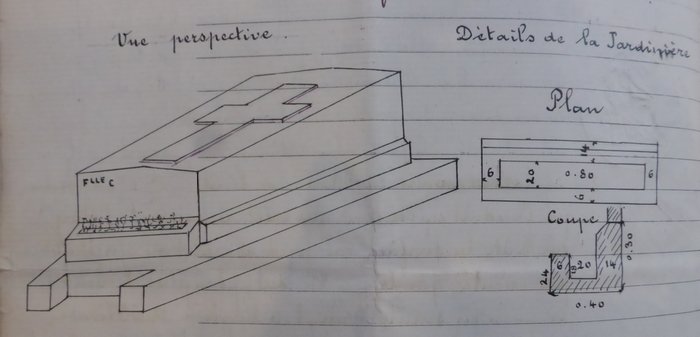 Mme veuve C avait demandé que la porte du caveau soit indépendante de la jardinière mais l’entrepreneur répond que « le coffret parisien est ainsi construit ».