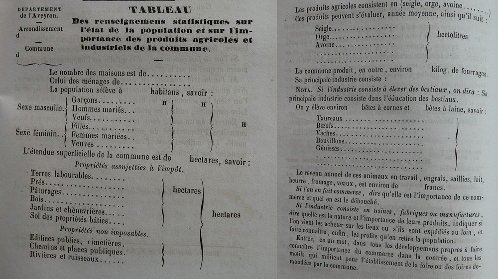 Dès 1838, il est demandé aux communes de fournir une liste de renseignements économiques de leur village : industrie, production, population. Mais c’est une circulaire du 05 juillet 1855 qui fixe un modèle très complet à remplir.