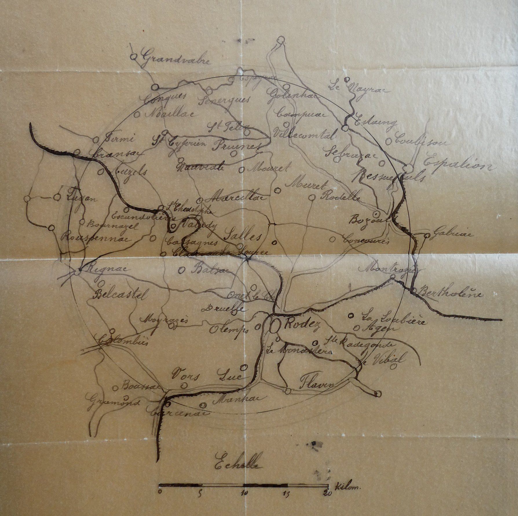 La carte topographique demandée dès 1838 permet de visualiser les communes à environ 20km à la ronde et le nombre de foires déjà existantes. En 1864, elles sont 80 dont 14 dans le canton : 7 à Marcillac, 3 à Pruines, 2 à Clairvaux et 2 à Valady.