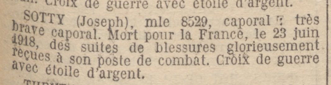 Joseph Sotty est promu soldat de 1 ere classe le 22 janvier 1918, il est nommé caporal le 10 mars 1918.