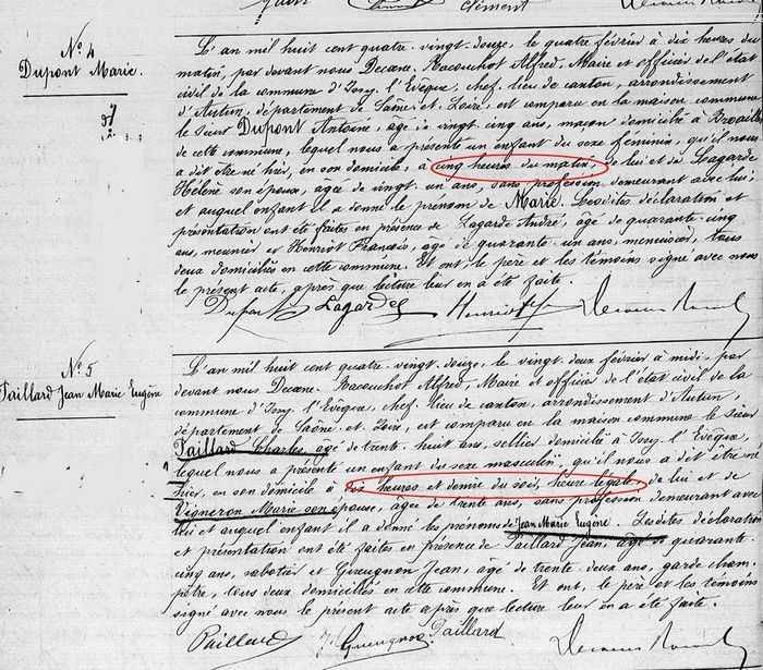 C’est une particularité des registres de l’état civil d’Issy l’Evêque (71). Le 4 février 1892, la naissance du jour est déclarée à 5 heures du matin… Point! Le 8 février 1892, le mariage a lieu à onze heures du matin “heure légale” .