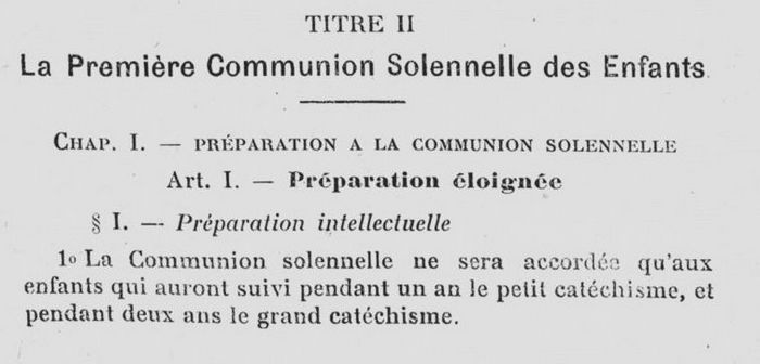 Pour la communion solennelle, elle n’est possible qu’après un an de petit catéchisme et deux ans de grand catéchisme. Les communiants doivent avoir 10 ans révolus au 1er janvier de la communion. Selon la revue religieuse du diocèse de Rodez de 1924, « on ne saurait invoquer, pour devancer l’âge d’admission, que dans certaines paroisses cette cérémonie n’a lieu que tous les deux ans ». Il vaut mieux retarder l’âge de la communion solennelle, l’enfant n’en sera que mieux préparé et instruit sur la vie religieuse.