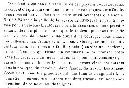 Cette famille est dans la tradition de ces paysans robustes, sains de coeur et d’esprit qui sont l’honneur de nos campagnes. Jean Comby nous a raconté sa vie dans une lettre aussi touchante que simple. Marié à 24 ans à la veille de la guerre de 1870-1871, il part à l’armée pour en revenir bientôt assister à la naissance de son premier enfant. Rien de plus reposant que le tableau qu’il nous trace de son existence de labeur. « Redoublant de courage, nous aidant mutuellement, ma femme et moi, nous vivions pour notre enfant, car tous deux aspirions à la famille; puis il en vint un deuxième,
