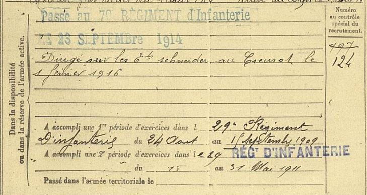Pierre Petitjean avait 33 ans. Sa fiche matricule comporte une erreur puisqu’elle le note affecté aux usines Schneider au Creusot le 1 er février 1916.