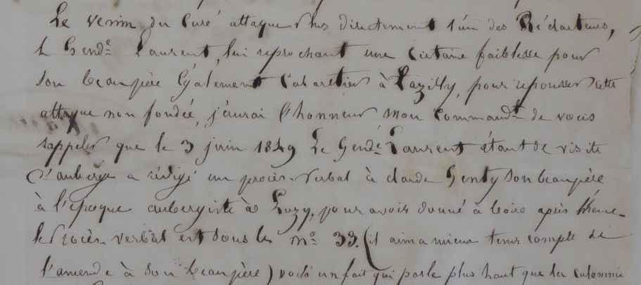 Il défie même les gendarmes de prouver ce qu’ils ont écrit dans leur rapport, se plaint auprès des personnes les plus notables dans tout le canton et même jusqu’à Bourbon Lancy. Il arrive à convaincre Mr Coujard de la Planche, Mr Perrin et beaucoup d’autres notables de l’aider à faire rouvrir le cabaret.
