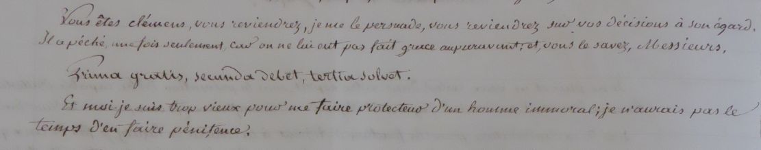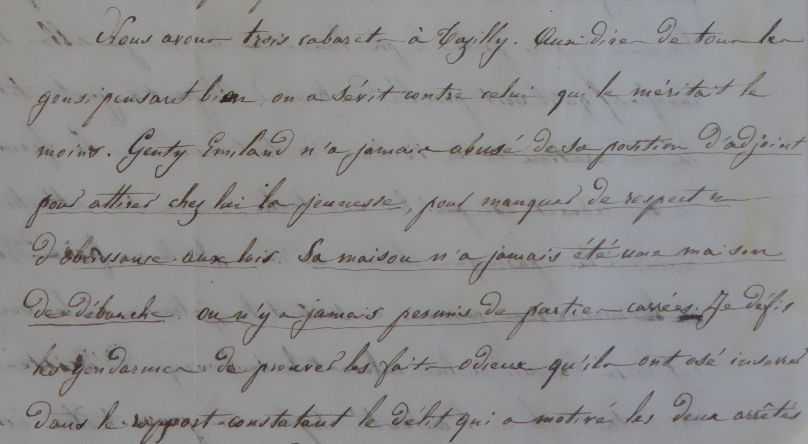 Mr D’Amfreville , père, apporte lui aussi sa lettre de réclamation en expliquant qu’Emiland Genty appartient au conseil municipal depuis 30 ans (en fait 10 ans seulement). Il conteste lui aussi le procès-verbal des gendarmes qui, selon lui, contient une mention que le sieur Genty ne respecte pas les arrêtés du préfet, qu’il abuse de son statut d’adjoint pour rester ouvert pendant les messes, qu’il nargue les autres cabarets et que le lieu sert de parties carrées, c’est-à-dire qu’il est en fait une maison de prostitution. Il termine sa lettre par la formule latin « prima gratis secunda debet tertia solvet » visant la clémence du sous-préfet envers Emiland Genty.