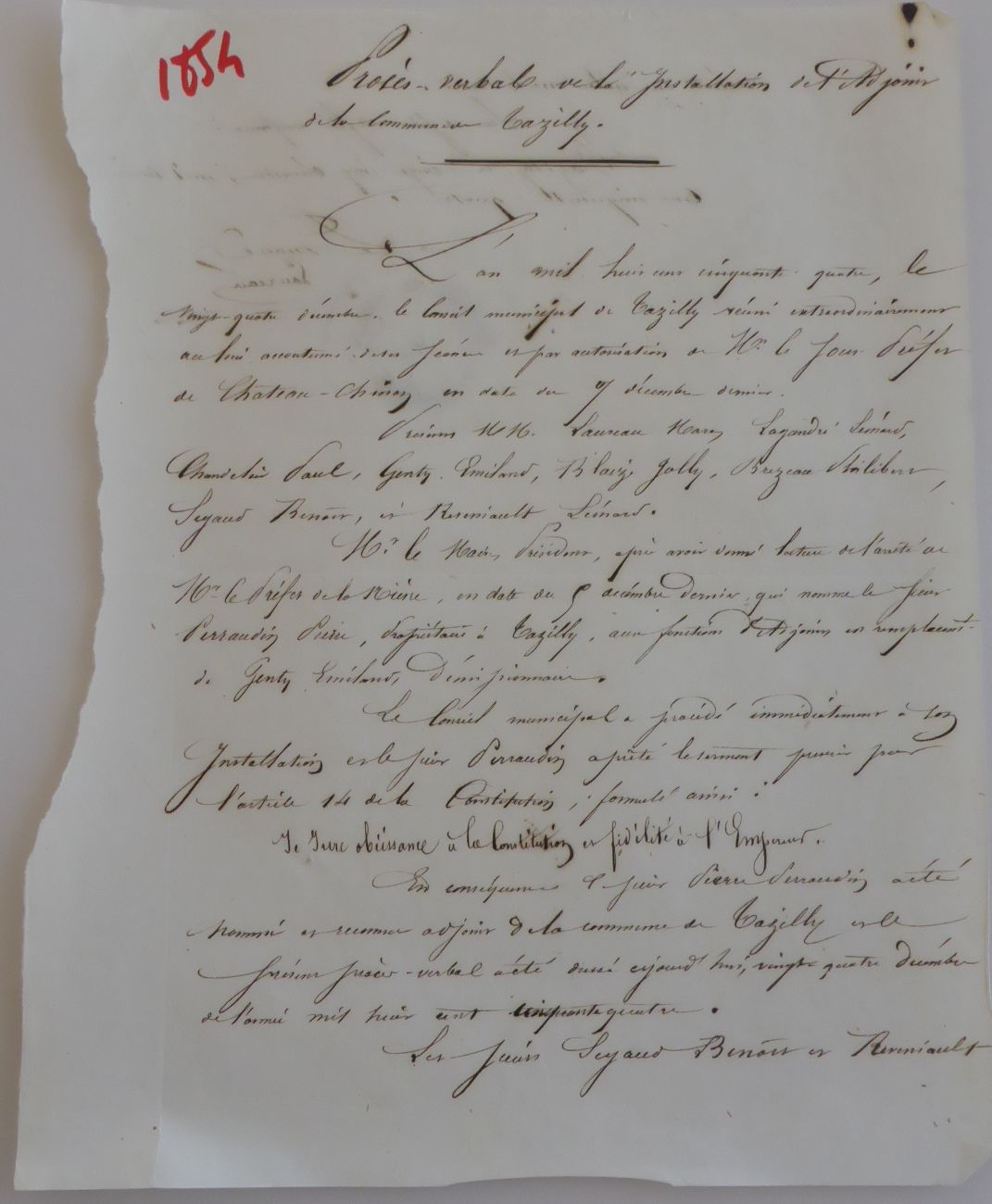 Pierre Perraudin est nommé adjoint par arrêté préfectoral du 5 décembre 1854 et prête serment le 24 décembre.