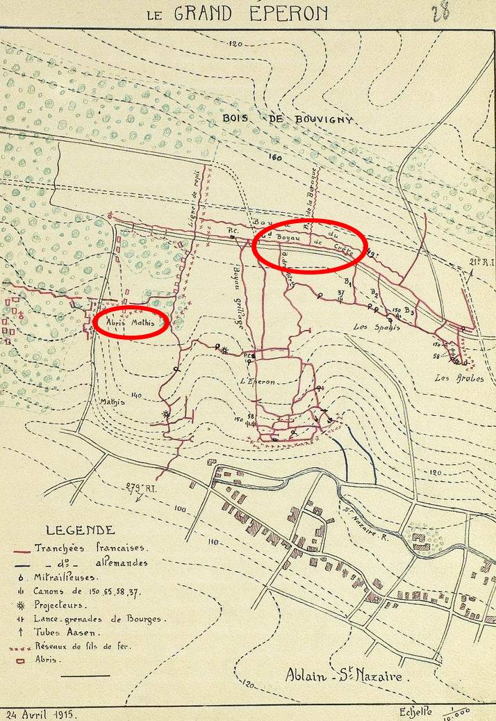 Le 22 avril 1915, le 21 ème RI expérimente les nouvelles torpilles aériennes de 60 kgs qui mettent à mal les tranchées ennemies. Deux jours plus tard, toutes les compagnies sont rappelées au front et voient les allemands sauter dans leur tranchée dont les défenses ont été détruites par d’incessants bombardements. L’artillerie arrose les tranchées ennemies pour éviter que des renforts n’arrivent et l’ennemi est finalement repoussé après un quart d’heure de lutte. Un des prisonniers allemands déclare que cette attaque n’était menée que par 2 compagnies et que la suivante le sera par 10 compagnies. A minuit, comme les tranchées ennemies ont une forte activité et que des baïonnettes sont aperçues sur les fusils, les français décident d’arroser ces lignes jusqu’à ce que le calme revienne. 2 tués et 19 blessés seulement sont signalés pour cette journée.