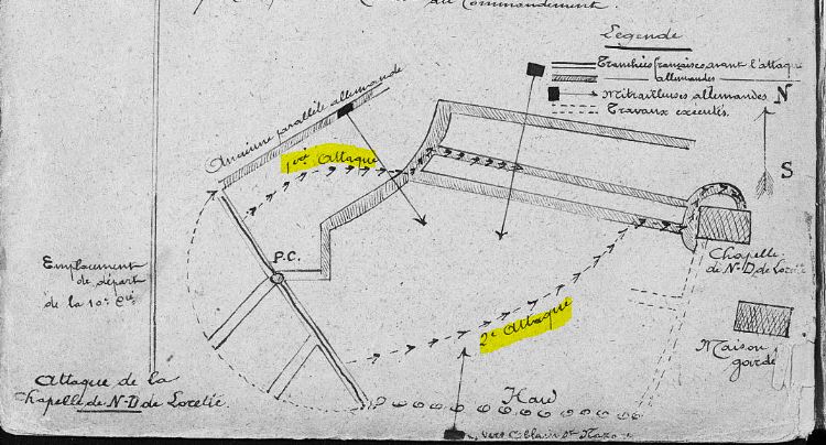 Le 12 mai 1915 à 3 heures, le lieutenant-colonel ordonne d’attaquer au plus tôt et avant 4H le blockaus et la chapelle de notre Dame de Lorette car les allemands contrattaquent. L’ennemi est repoussé par l’infanterie uniquement car malgré l’envoi de signaux lumineux, l’artillerie n’est pas venue en aide des soldats. Une première attaque est lancée devant la mitrailleuse allemande avec pour mission de faire face à la chapelle de Notre Dame de Lorette. Une deuxième attaque est effectuée sous le feu croisé de 3 mitrailleuses et la chapelle est finalement atteinte et contournée.