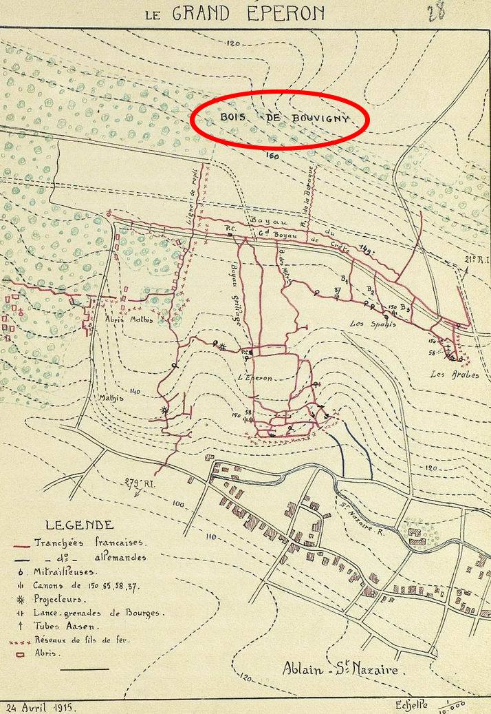 Le 26 mars 1915, l’aviation ayant signalé de nombreux feux de bivouac sur la partie Est d’Arras, le 21 ème RI est en alerte, mais les 4 jours suivants s’égrènent sans « rien à signaler. »