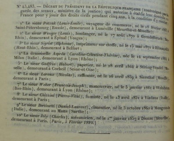 Par décret du 5 février 1894, François Joseph Weber est admis à établir son domicile en France pour y jouir des droits civils pendant 5 ans.