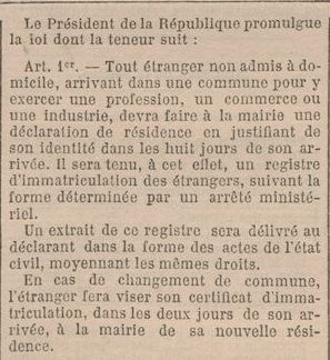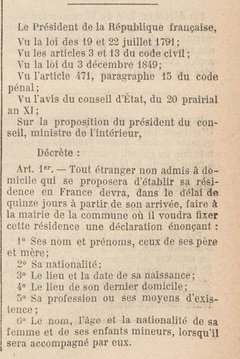 Etant étranger et suite au décret du 2 octobre 1888, il fait sa déclaration de domicile au commissariat du quartier de la bourse le 2 septembre 1889.