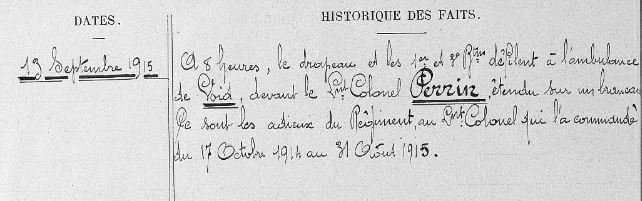 Il repart au front le 11 septembre 1915 et arrive probablement un jour trop tard pour défiler devant le Colonel Perrin étendu sur un brancard.
