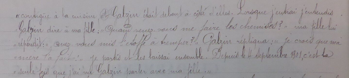 C’est le père de Louise qui précise que Marius Galzin était chez lui le mercredi 18 ou le jeudi 19 septembre où il l’a trouvé en compagnie de sa fille et de son ouvrière. Les filles cousaient dans la chambre à côté de la cuisine. Le père se souvient de la date car il pleuvait et il avait dû rentrer à l’improviste chez lui pour récupérer une blouse avant de retourner vendanger. Les jeunes gens parlaient de chemises, à moins qu’il ne s’agisse d’un langage codé entre eux…