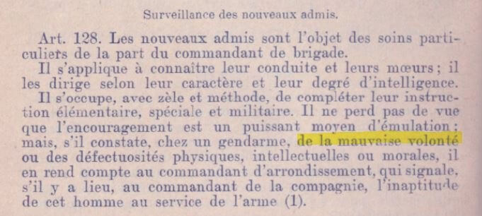 Un rapport est fourni en vertu de l’article 128 du décret du 4 avril 1900 signalant l’inaptitude au service de l’armée et plus principalement pour mauvaise volonté.