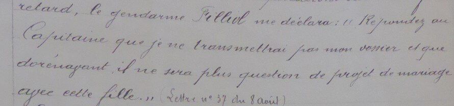 Finalement toute relation avec la voisine d’en face est interdite à Filliol par le commandant d’arrondissement et son brigadier est chargé de le surveiller car le gendarme s’est désintéressé de son travail