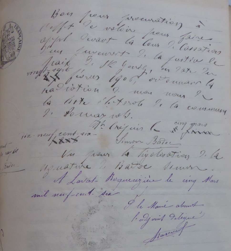 Simon Badoc ne se laisse pas faire, il se pourvoit en cassation le 8 mars 1906 par l’intermédiaire d’une procuration donnée à Victor Bouscary secrétaire de la mairie de Pomayrols.