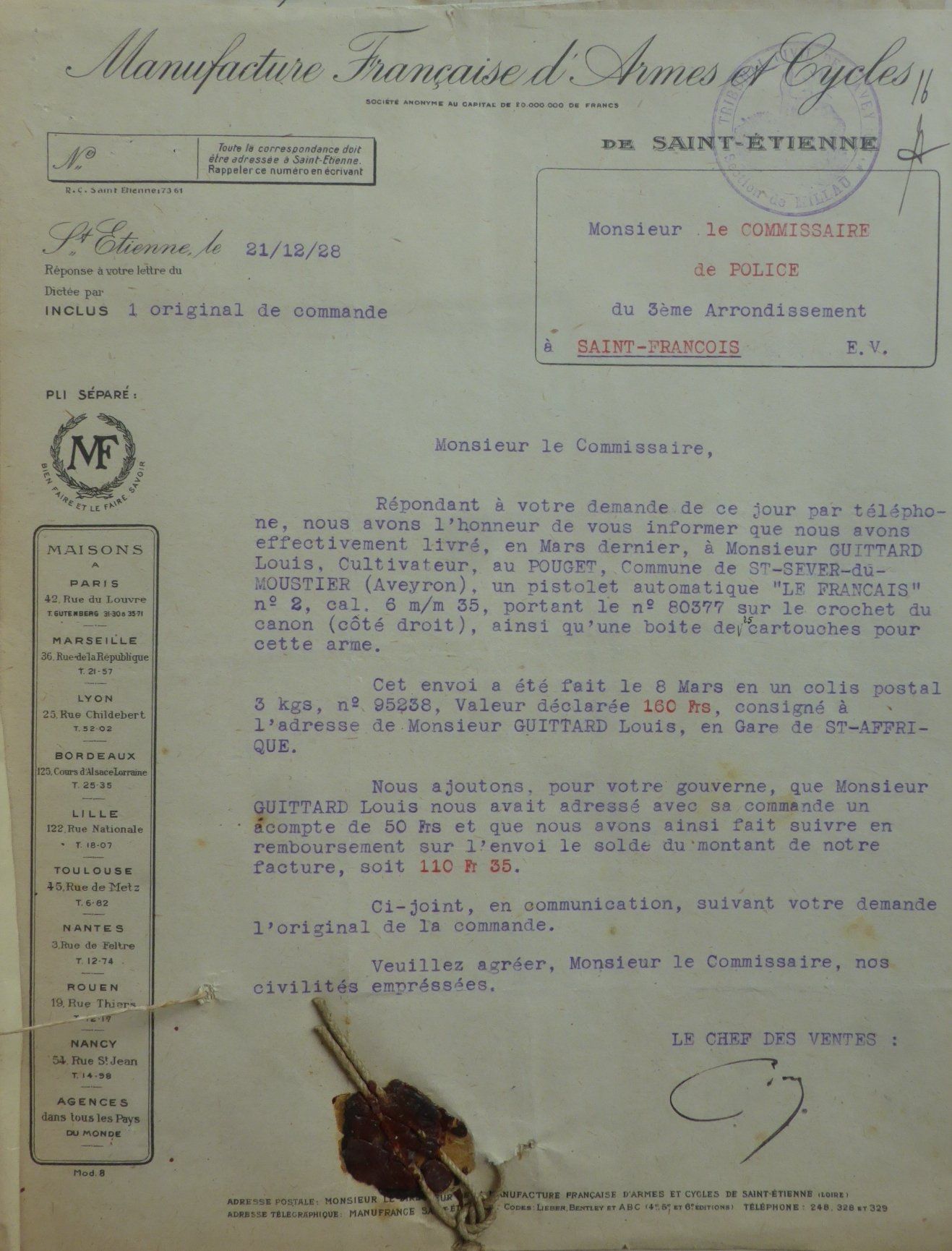 Le 8 mars, Louis Guittard reçoit son pistolet automatique « le français » calibre 6m/m 35 qu’il a commandé à la manufacture de Saint Etienne .
