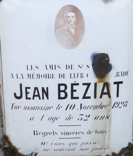 La stèle est à flanc de colline le long de l’actuelle départementale 74 à Saint-Séver-du-Moustier en Aveyron. La plaque est composée d’une photo qui s’efface et porte la mention « Les amis de St Séver à la mémoire de leur camarade Jean Béziat tué assassiné le 10 novembre 1928 à l’âge de 32 ans. Regrets sincères de tous. Oh vous qui passez, un souvenir une prière. »