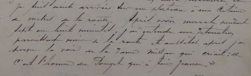 Dans l’autre famille, la mère de la victime était sur la même route que son fils. Elle croise le meurtrier puis, après avoir pris un raccourci et marché quelques minutes, elle entend une détonation et entend Mme Millau dit « c’est l’homme du Pouget qui a tué Jeanou. » Elle comprend et se précipite et reconnait son fils .