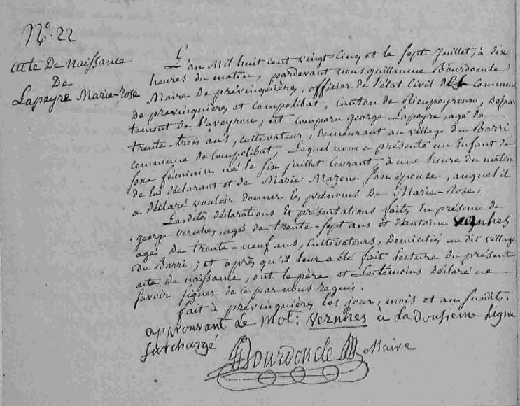 Marie Rose Lapeyre est née dans un petit village de l’Aveyron. En retraçant sa vie avec les documents d’archives, on obtient une vie bien ordinaire : née le 7 juillet 1825 de Georges et Marie Mazenc, elle perd son père à 4 ans et sa mère à 32 ans. Elle décède célibataire en août 1898. Voilà pour l’état civil.