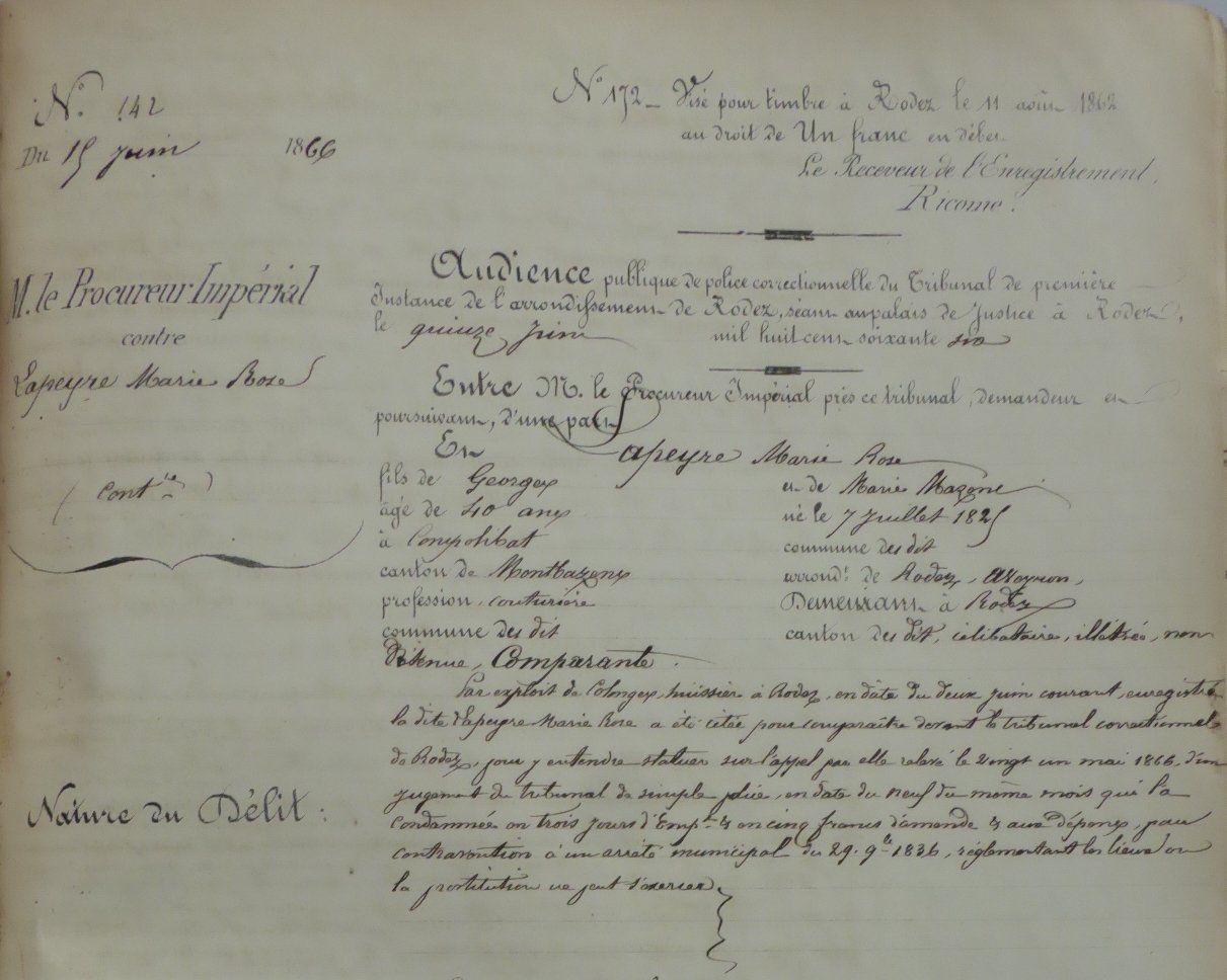 En faisant une recherche plus élargie , on trouve une condamnation de Marie Rose dite “la Meyssonnière” au tribunal de Rodez en 1866. Elle est accusée de prostitution !