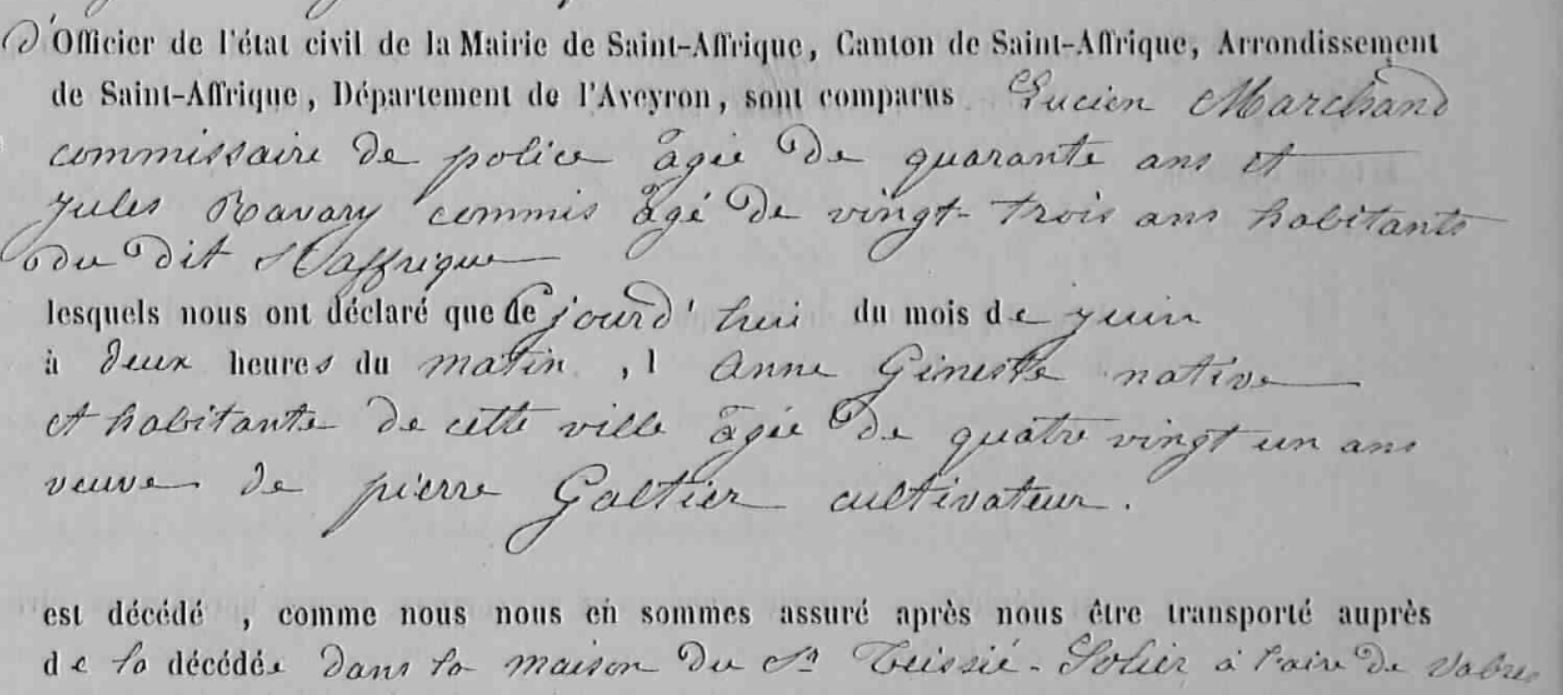 Le 29 juin 1868, Anne Gineste veuve Galtier, âgée de 81 ans décède à Saint Affrique. Les deux témoins sont Lucien Marchand, commissaire de police et Jules Ravary, commis, tous les deux de cette ville.