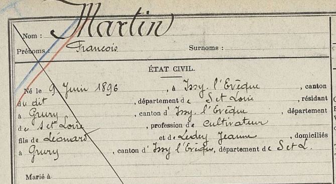 François Martin est né le 9 juin 1896 au hameau de la Croix à Issy l’Evêque. Ses parents, Léonard Martin et Jeanne Ledey sont agriculteurs. Ils prennent en pension Marcel, d’un an le cadet de François. Le petit est né à Paris de Marguerite Martin.
