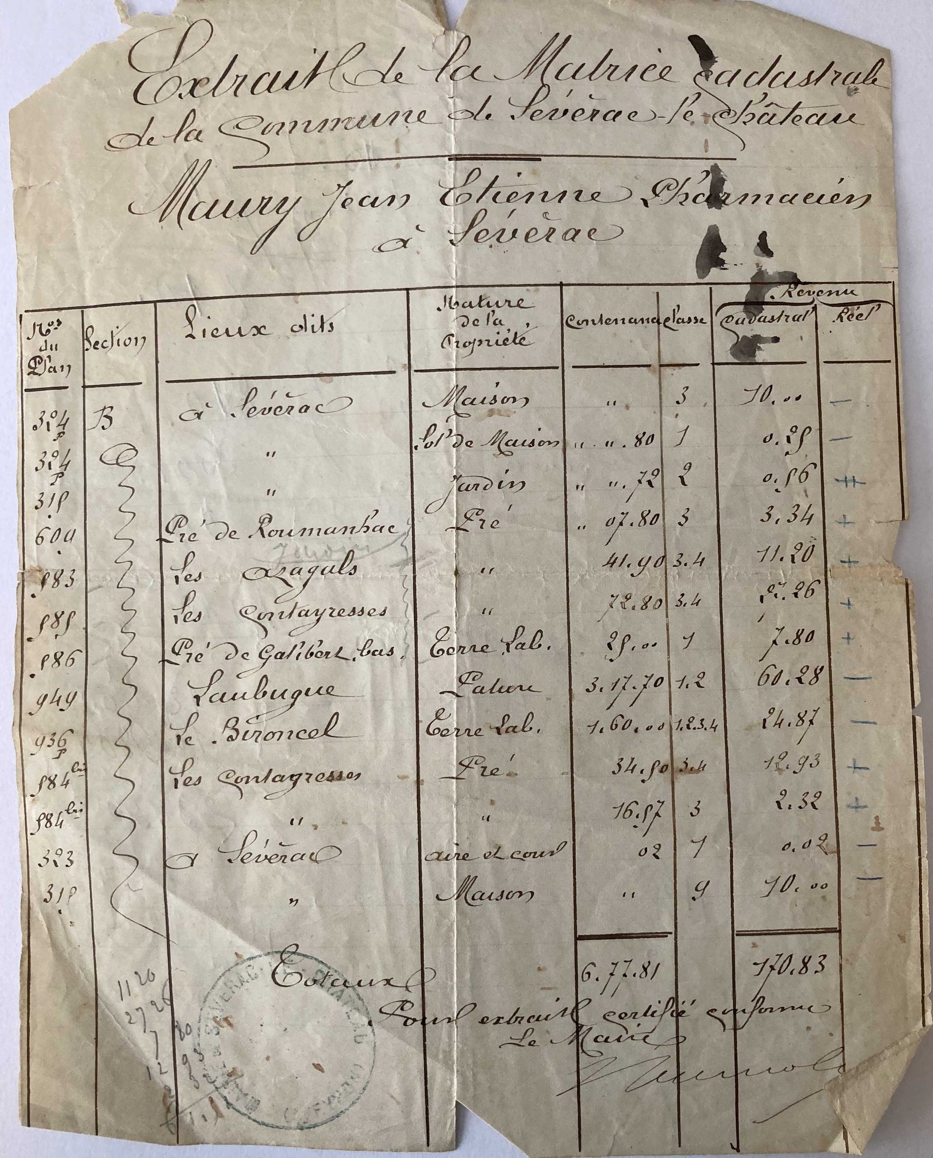 Cet extrait de matrice cadastrale était en annexe d’un acte notarié de vente des biens du propriétaire. Les signes de la valeur réelle du bien ont pu être faits par le notaire, pour juger du prix des biens.